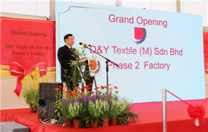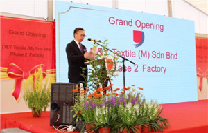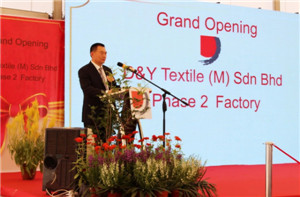 柔佛州國際貿(mào)易、投資及公用事業(yè)委員會主席潘偉斯致辭,他說早在2014年,岱銀集團就在馬來西亞柔佛洲士年納工業(yè)園投資建設(shè)10萬紗錠高檔精梳紗項目,并于2015年5月份實現(xiàn)峻工投產(chǎn),項目對于擴大當?shù)氐慕?jīng)貿(mào)總量和出口創(chuàng)匯起到了積極的促進作用,成為士年納工業(yè)園區(qū)的一個示范項目。岱銀紡織馬來西亞公司二期12萬紗錠項目的建成,是岱銀集團搶抓中國“一帶一路”建設(shè)契機,深入實施國際化戰(zhàn)略的又一項重要成就,項目的建成將進一步帶動當?shù)亟?jīng)濟和社會的發(fā)展,創(chuàng)造更多的就業(yè)機會,增加當?shù)刎斦杖牒统隹趧?chuàng)匯,并吸引更多的中國企業(yè)到馬來西亞來投資建廠,為推進中馬雙方友好往來與經(jīng)濟合作發(fā)揮積極的作用。