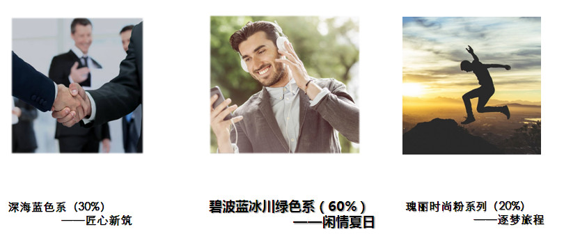 關(guān)鍵單品:休閑系列 單西、襯衣、夾克、風(fēng)衣、T恤、休閑褲。本系列體現(xiàn)的是都市休閑風(fēng)格,色彩主要為碧波藍(lán)和冰川綠色系,更加年輕時(shí)尚,更加適合新商務(wù)人群。