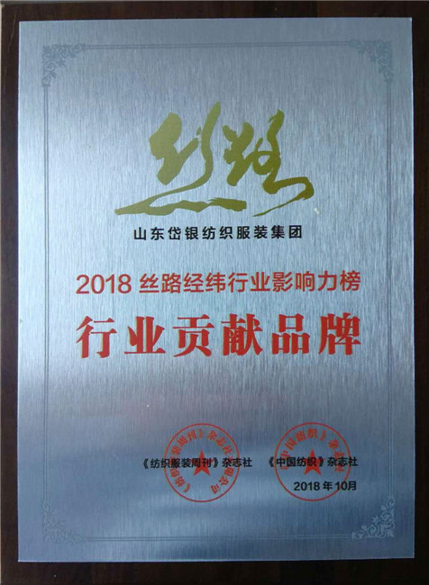 在馳名中外的泰山腳下,山東岱銀紡織服裝集團憑著一種勇攀高峰的登山精神,用實干創(chuàng)新和不懈進取,在新絲綢之路上放飛著“創(chuàng)民族品牌,做百年企業(yè)”的夢想,已由一個小型棉紡廠發(fā)展成為發(fā)集紡紗、織布、服裝、進出口貿(mào)易、跨國經(jīng)營于一體的大型企業(yè)集團,相繼榮獲“全國棉紡織行業(yè)競爭力排名前20強企業(yè)”、“全國服裝雙百強企業(yè)”、“全國優(yōu)秀民營企業(yè)”等一系列榮譽稱號。此次獲評“2018絲路經(jīng)緯行業(yè)影響力榜行業(yè)貢獻品牌”,充分彰顯了岱銀集團在行業(yè)內(nèi)的品牌影響力和綜合實力。