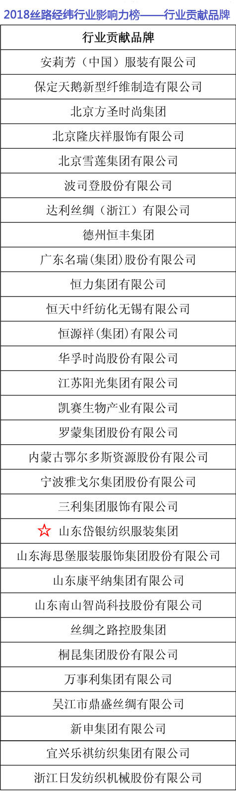 日前,在首屆絲路論壇上,中國紡織工業(yè)聯(lián)合會會刊《紡織服裝周刊》雜志社、《中國紡織》雜志社聯(lián)合發(fā)布“2018絲路經(jīng)緯行業(yè)影響力榜單”,經(jīng)過嚴格評選岱銀集團成功入選榜單,獲得“2018絲路經(jīng)緯行業(yè)影響力榜行業(yè)貢獻品牌”殊榮。